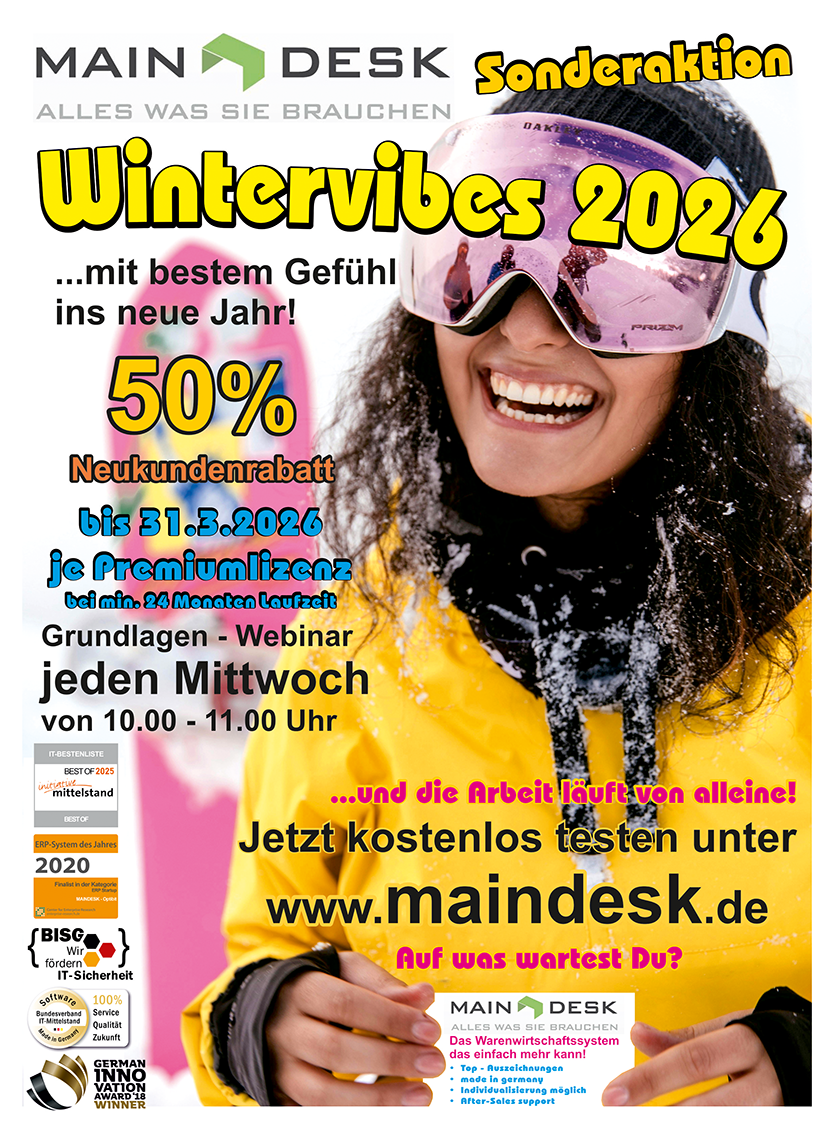 Unser Hauptprodukt, MAINDESK, unterstützt Unternehmen effizient in den Bereichen Warenwirtschaft, Fakturierung, CRM und Finanzbuchhaltung. MAINDESK passt sich an die Anforderungen Ihres Unternehmens an und ermöglicht Ihnen, Geschäftsprozesse nahtlos zu steuern.